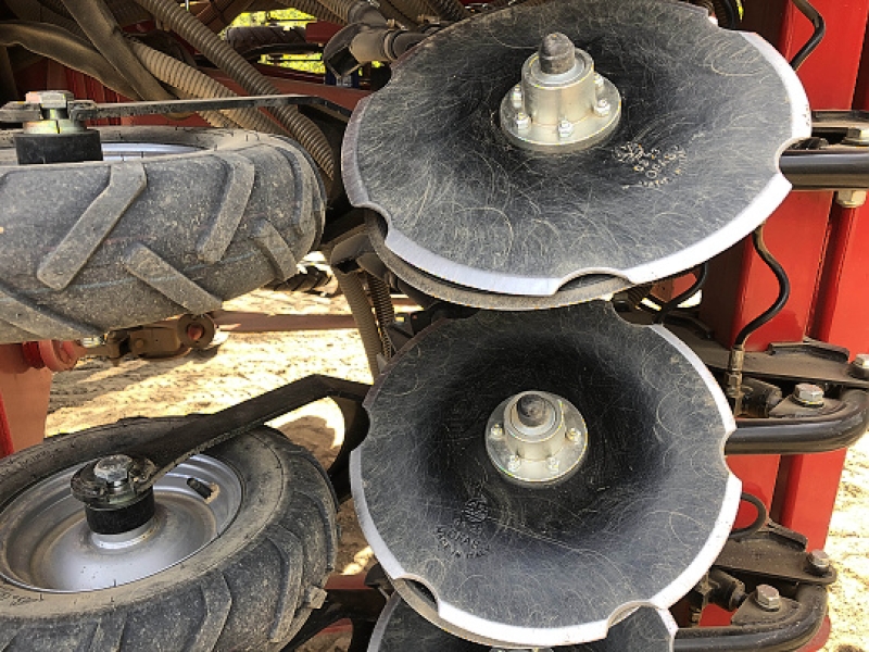 Na tomto obrázku ve dobře vidět klíčová vlastnost secí botky GD – řazací disk (ten větší) vniká do půdy pod úhlem, menší disk skývu pouze přizvedne a pneumatiky kolečka výsevní jednotky pak výsevní drážku řezanou z boku pod úhlem uzavře a utuží.
